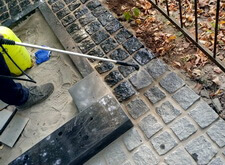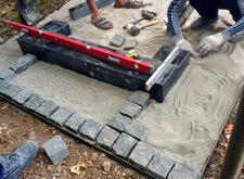 Приступаем к созданию наземного покрытия. По просьбе клиента в центре участка будет находиться широкий цветник, остальную же территорию предполагается замостить гранитной брусчаткой. Засыпаем геотекстиль пескобетонной смесью и укладываем брусчатку, параллельно монтируя цветник из гранитных балок.