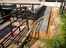 Далее представлено промежуточное состояние участка: полностью собран каркас, уложена брусчатка, установлены подставки под памятники и цветники.