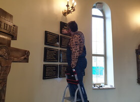 В день монтажа мы доставили готовые таблички в храм, предварительно сняв со стены висевшую там мраморную доску.